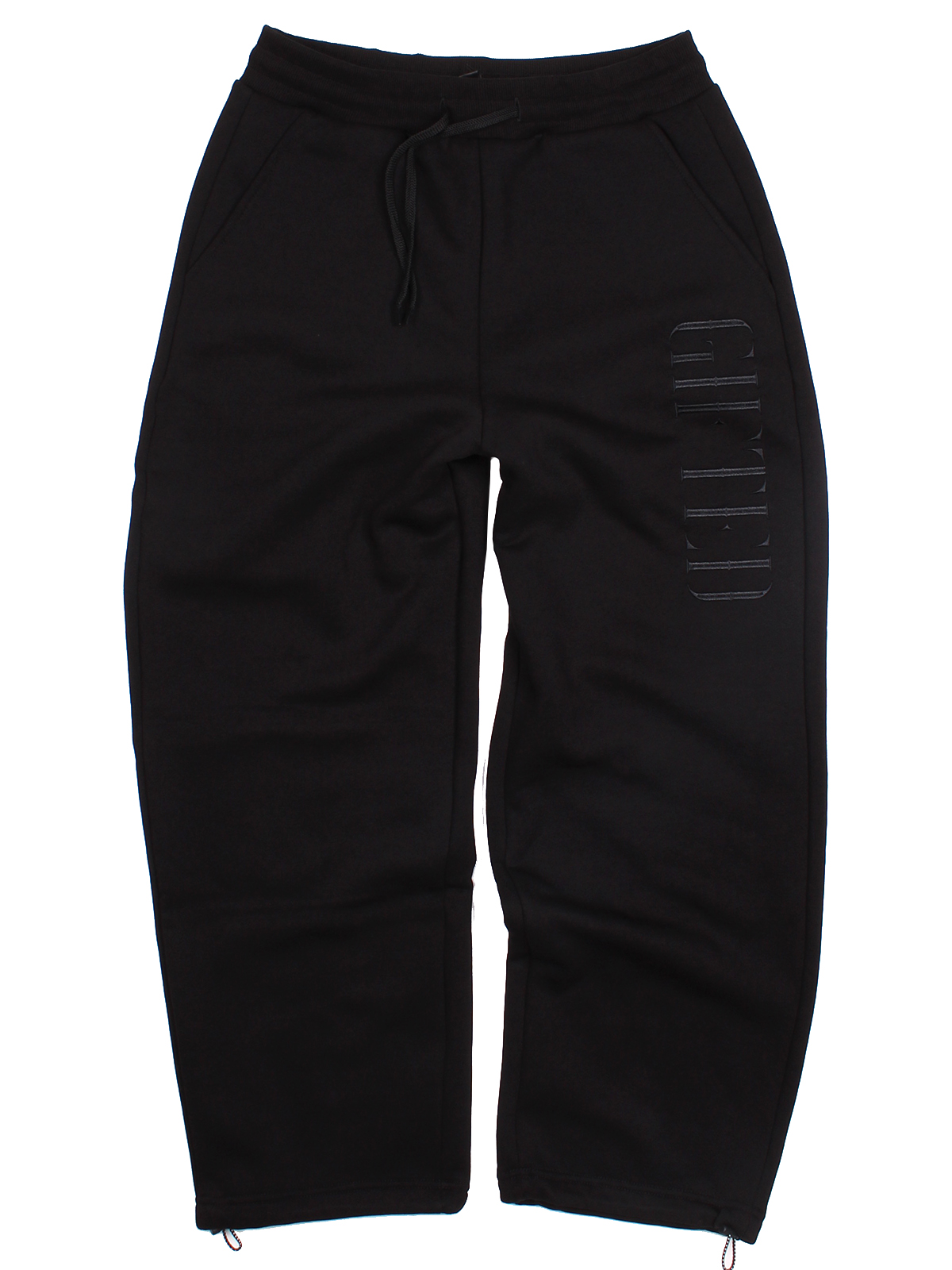 Затяжки по низу штанины. Можно носить, как трубы, а можно и как классические спортивки.