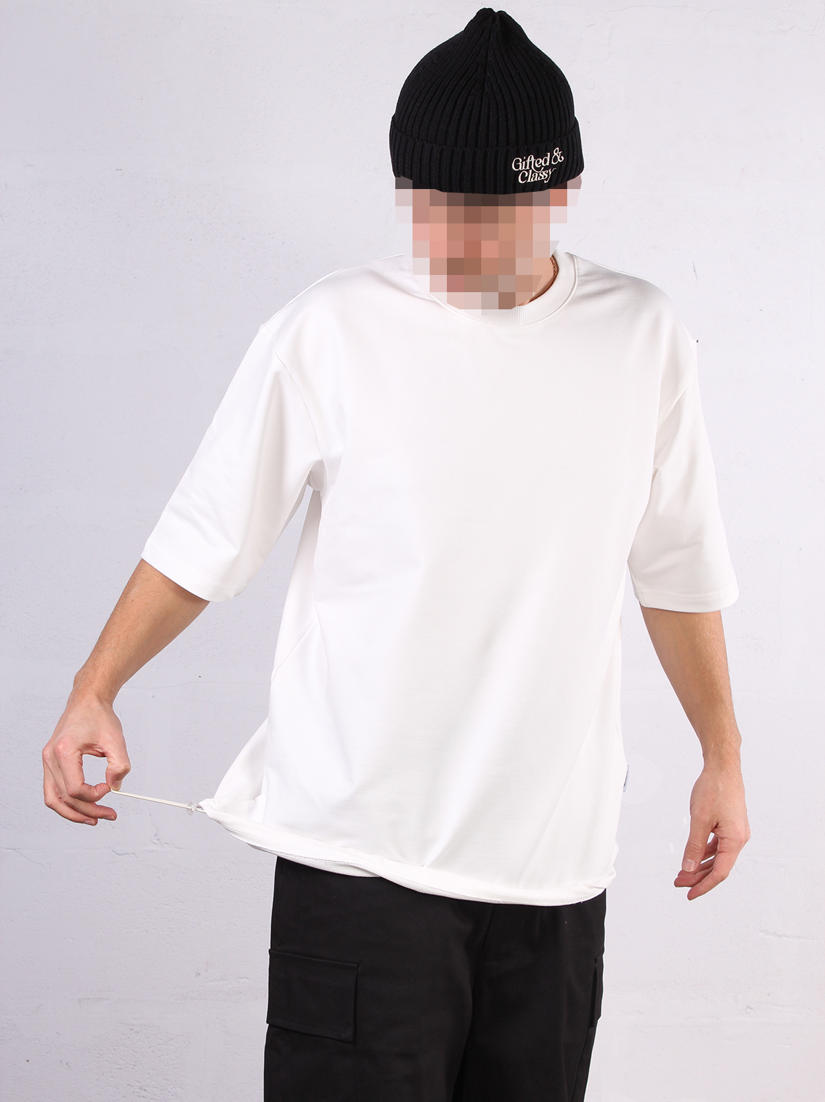 Мы добавили по низу футболки эластичный шнур с фиксатором.