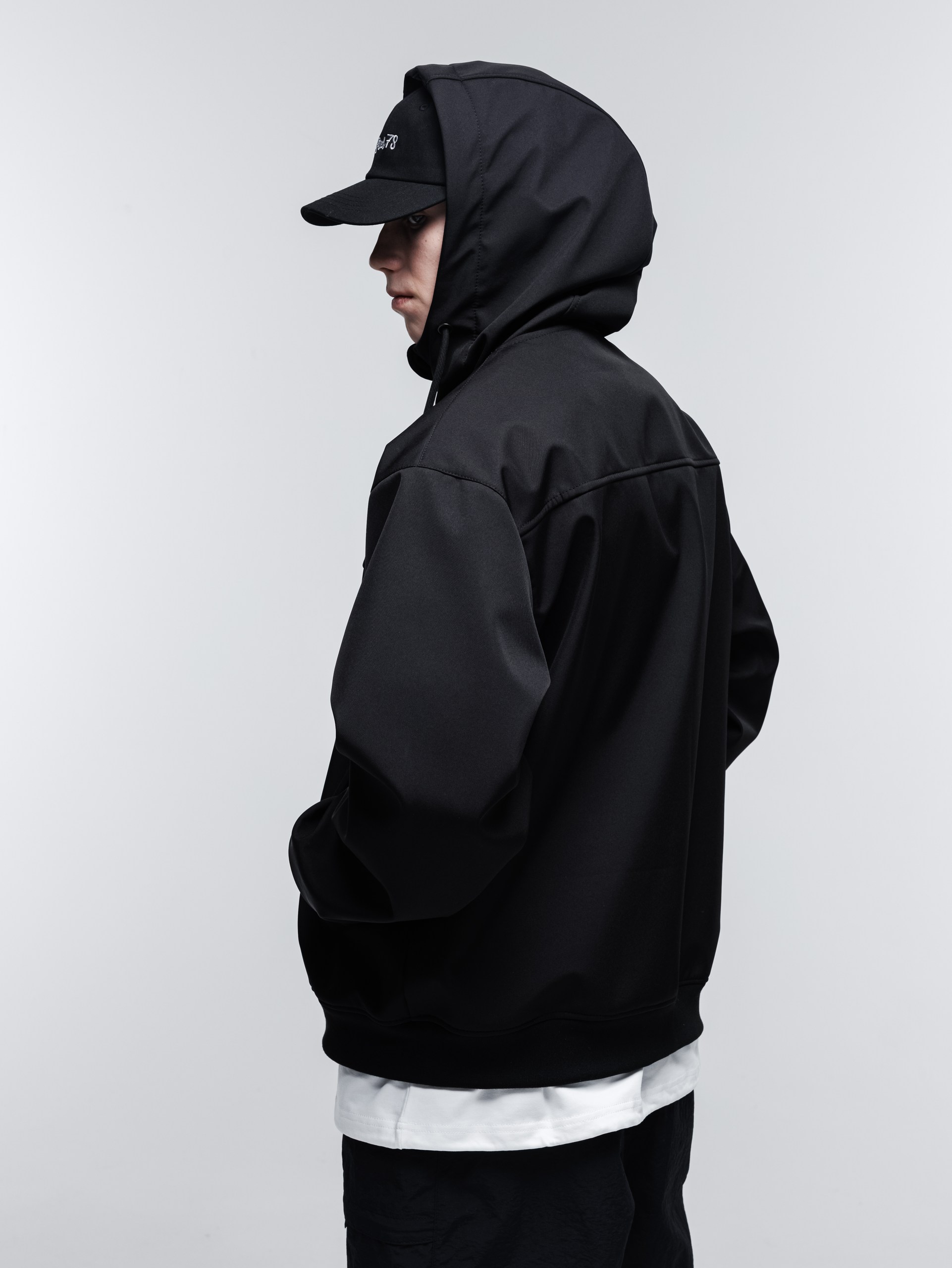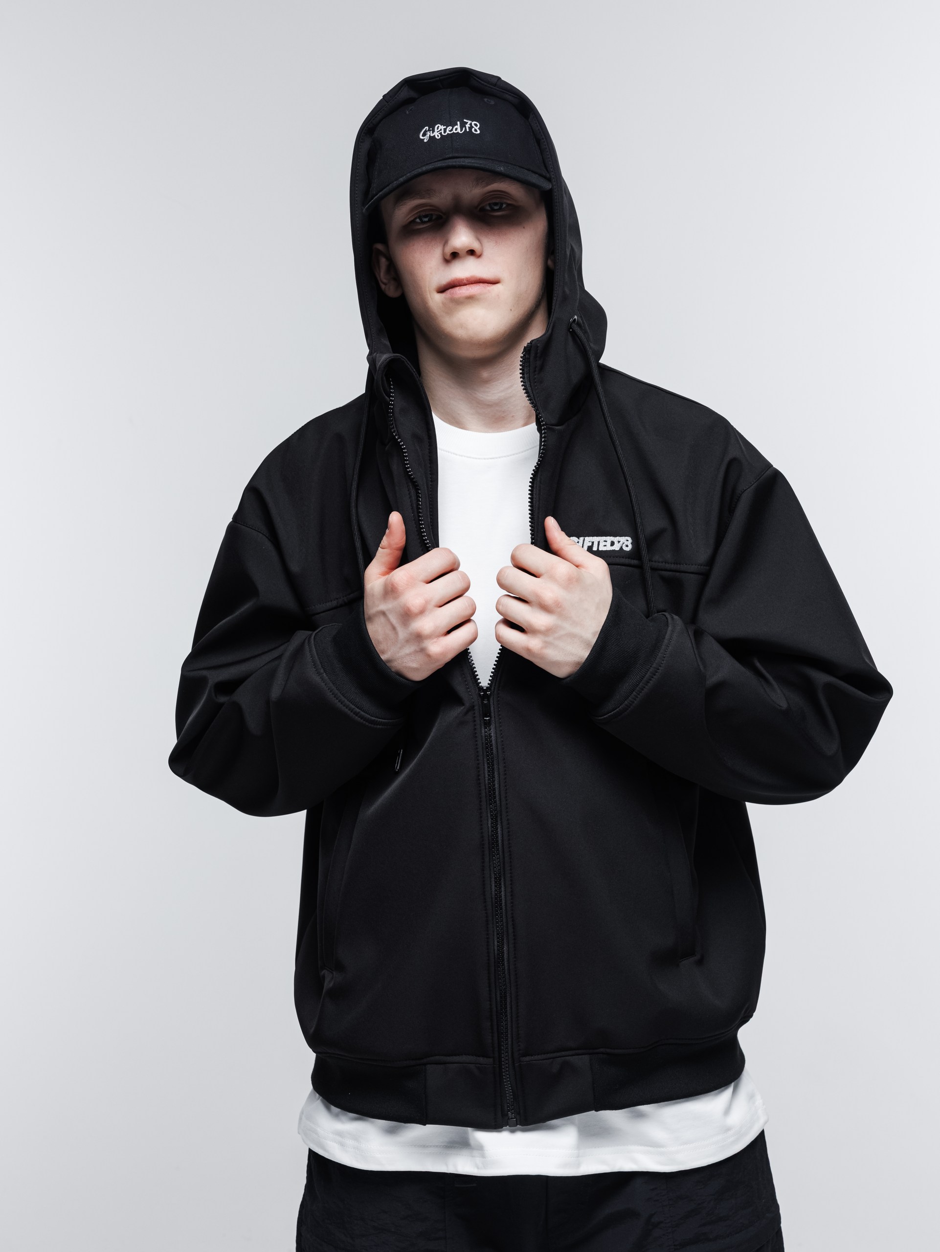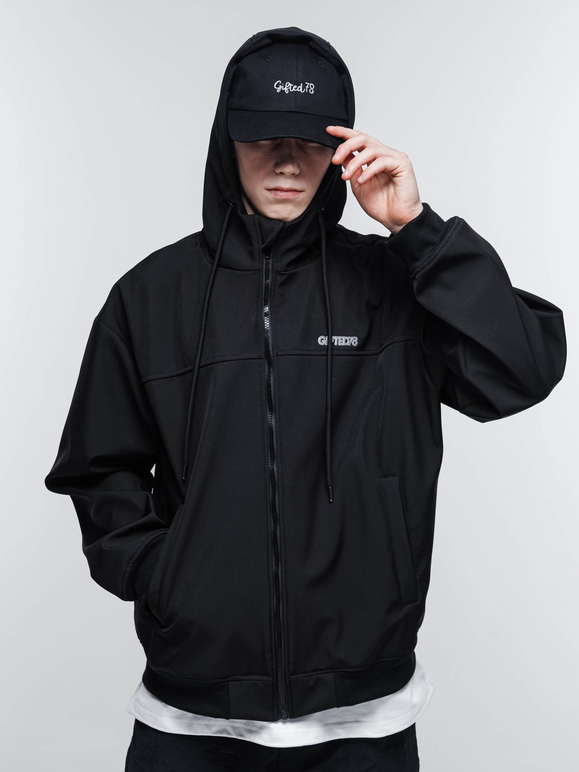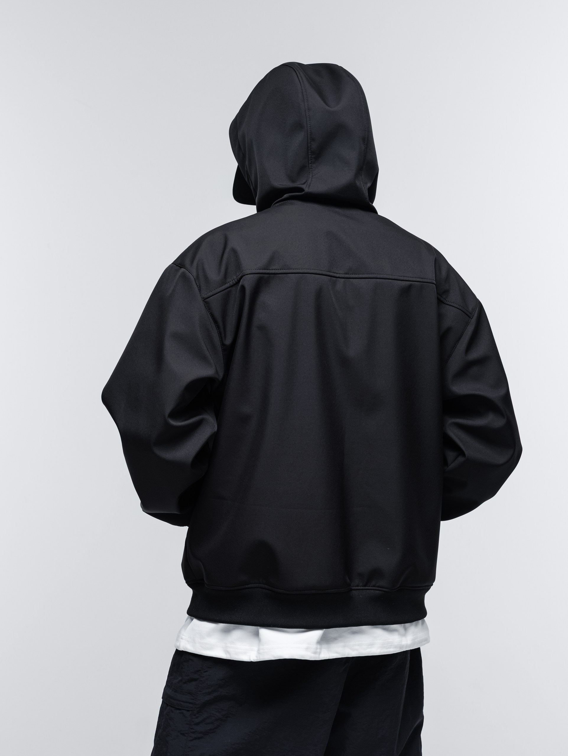 В этом году из софтшелла мы сшили куртку-худи. Достаточно широкий фит, удобный капюшон с высоким воротом, качественные манжеты и пояс, связанные на заказ.