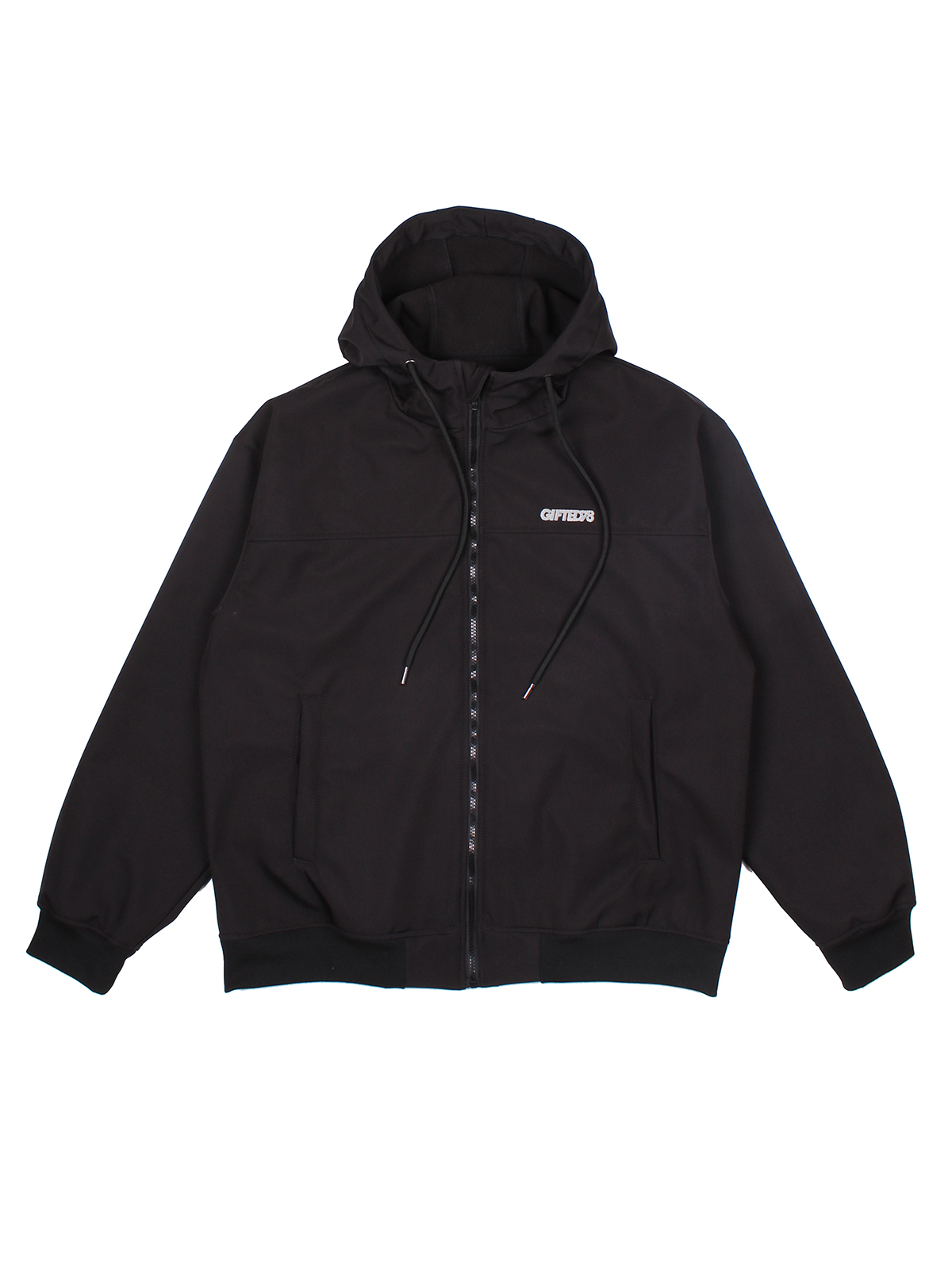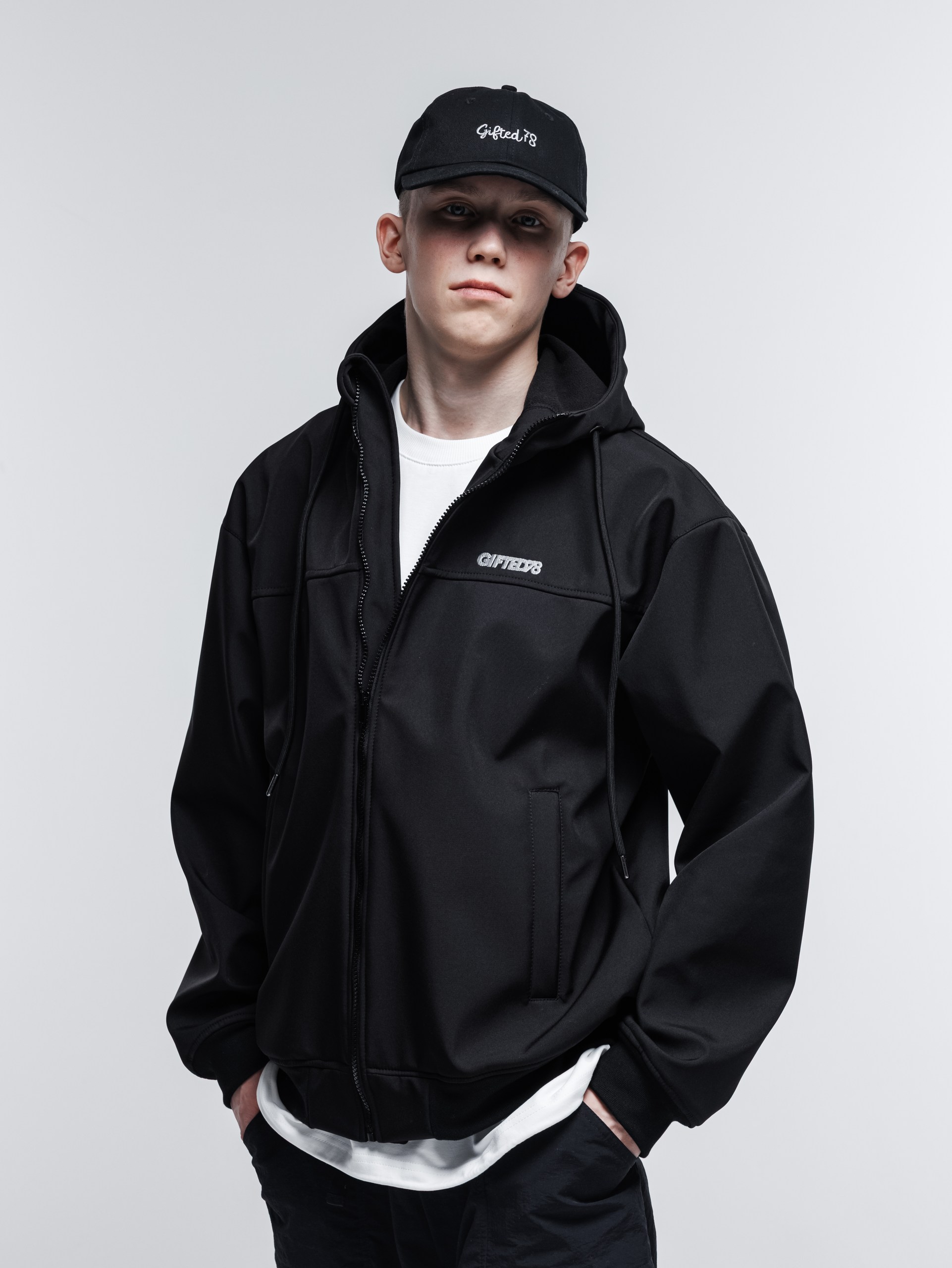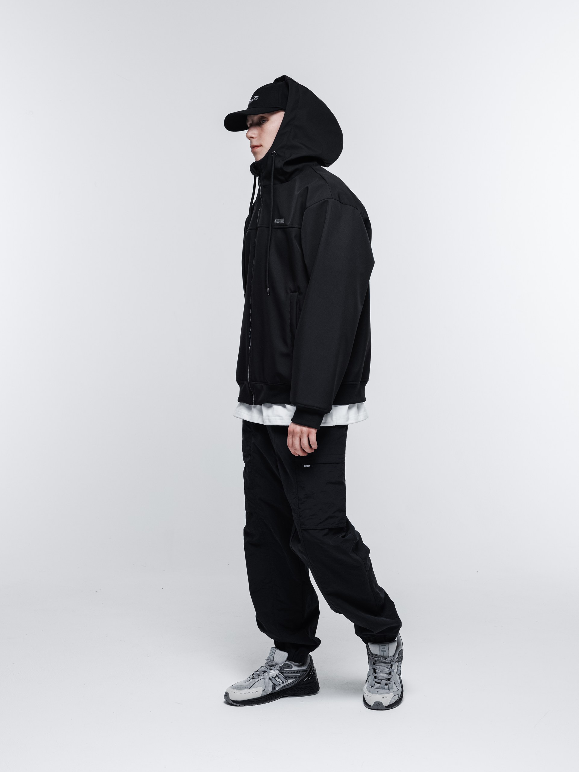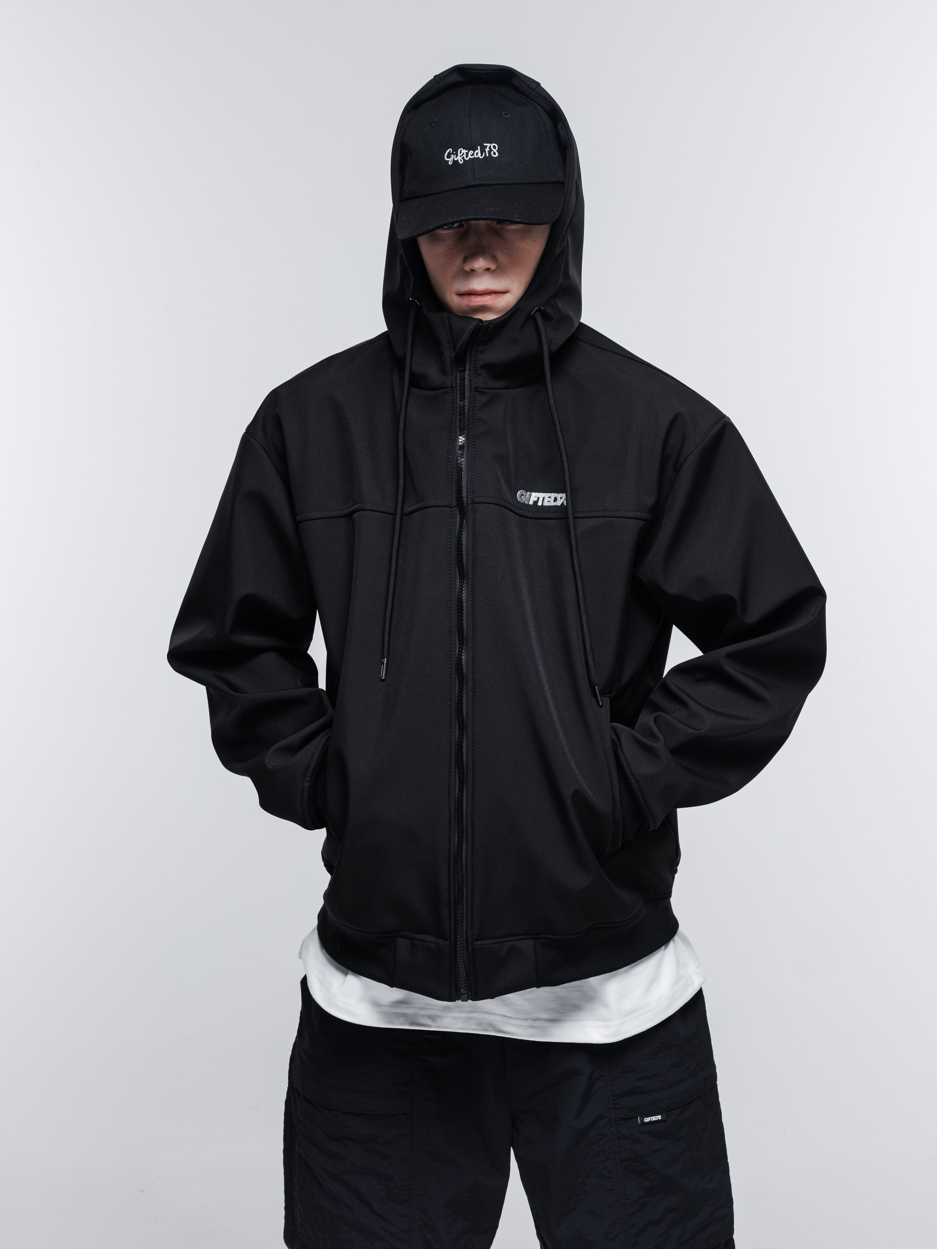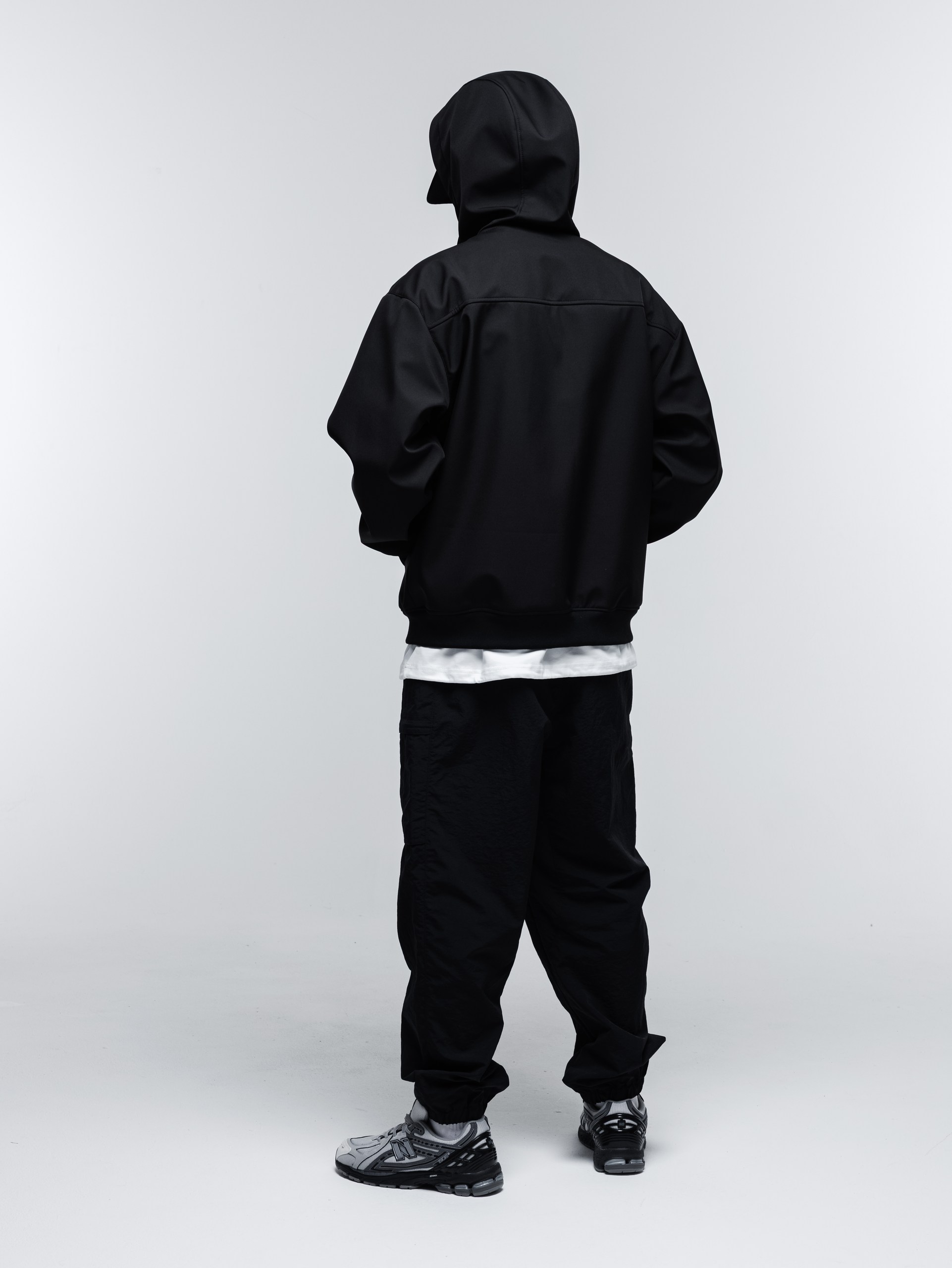В этом году из софтшелла мы сшили куртку-худи. Достаточно широкий фит, удобный капюшон с высоким воротом, качественные манжеты и пояс, связанные на заказ.